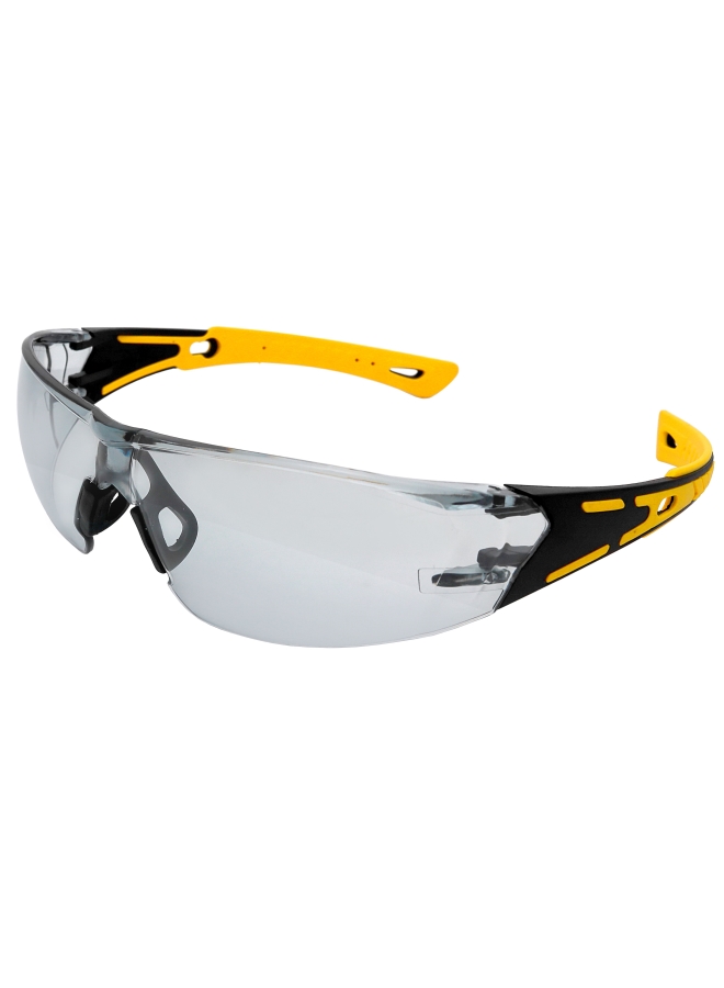 Панорамные затемненные линзы, два уровня защиты: фронтальный, боковой. Дужки двухцветные из тэрмоэластопласта (ТЭП). На переносице и заушниках мягкий, тактильно-приятный материал.