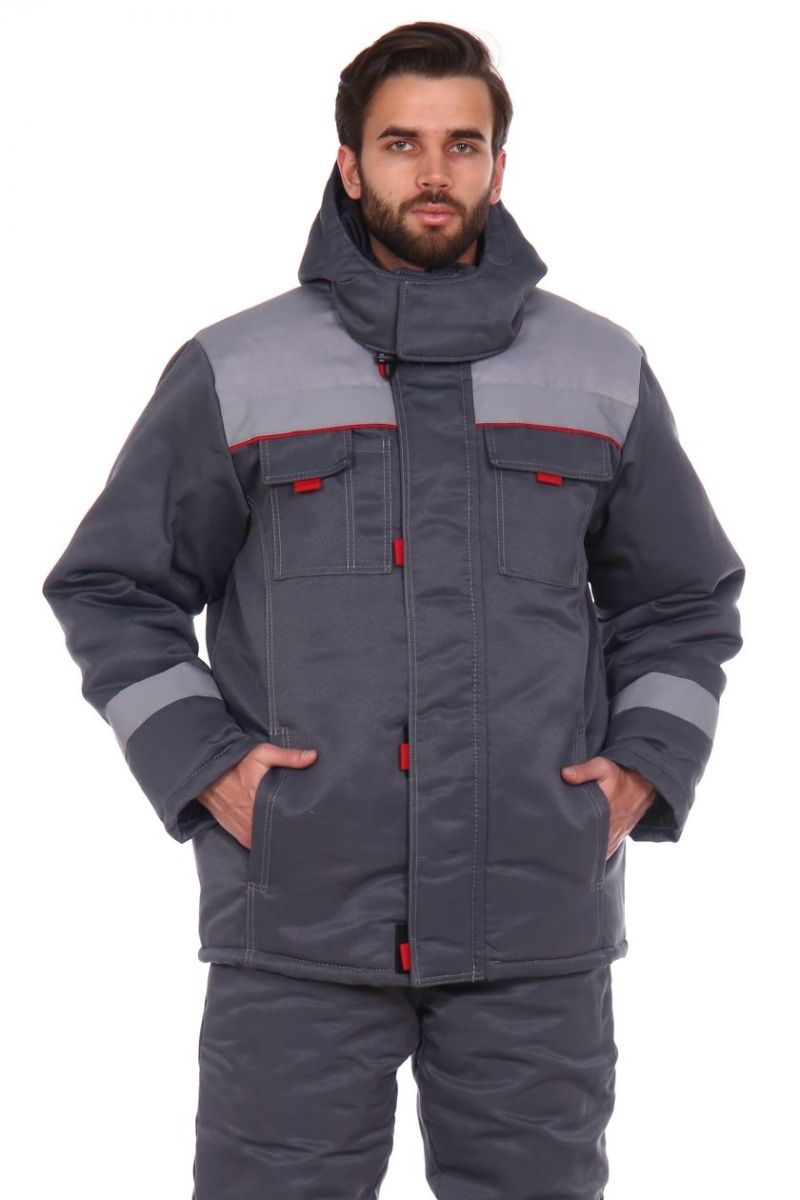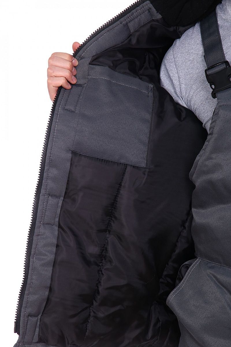 Карманы: нагрудные — накладные с клапаном, застегиваются на один контакт липучки; нижние — обработаны в рельефных швах, утепленная верхняя сторона мешковины внутреннего кармана.